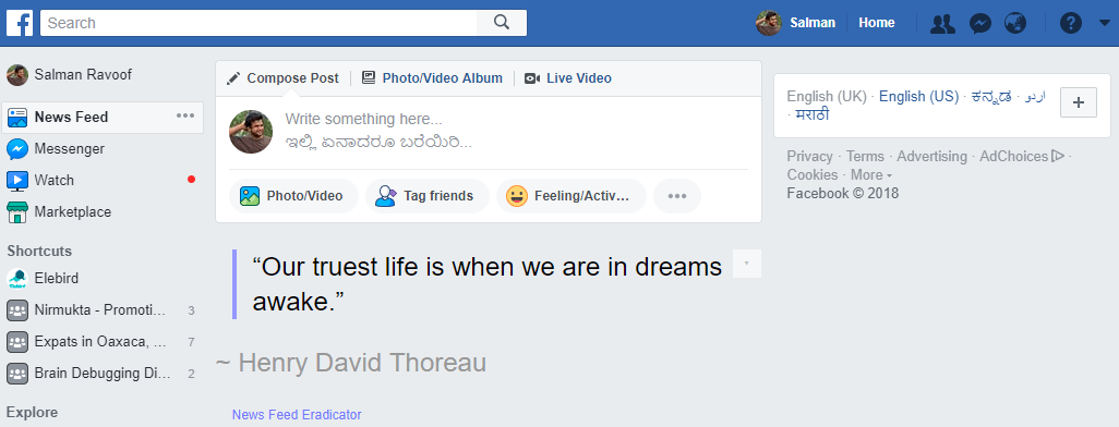 I do all my work on the laptop, and I do need the internet to work. How can I be productive if the device that I use to work also makes me wander off into unproductive territories? To mitigate that, I’ve installed a Chrome browser add-on that disables the Facebook newsfeed and replaces it with a simple motivational quote.